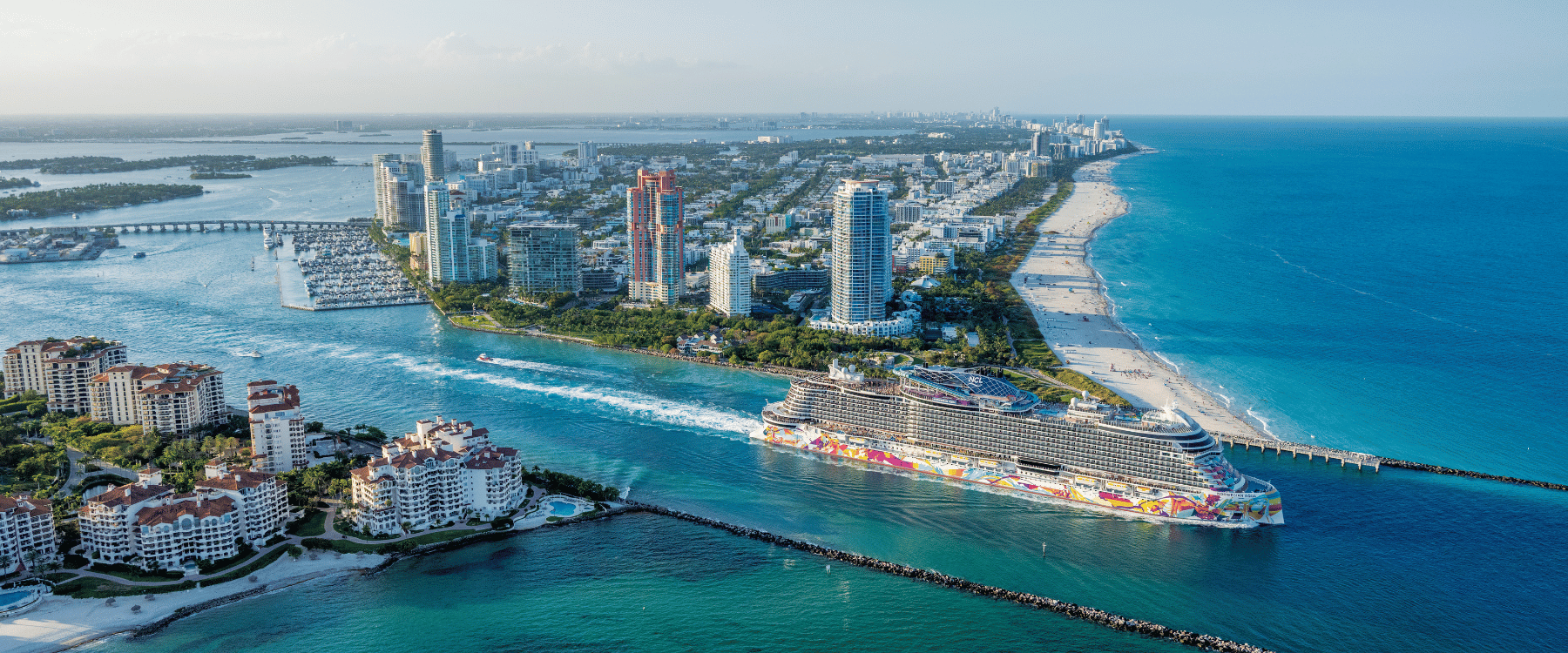 Blick über die Reling eines Kreuzfahrtschiffs auf das offene Meer. Die Kielspur des Schiffs zieht sich in die weite, blaue Ferne.